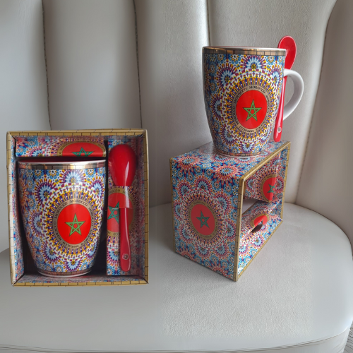 Découvrez notre coffret artisanal marocain, mettant en vedette un verre en poterie traditionnel accompagné de sa cuillère assortie. Ce set unique capture l’essence de l’artisanat marocain à travers des motifs authentiques et des couleurs vibrantes, inspirées des paysages ensoleillés et des souks animés du Maroc.